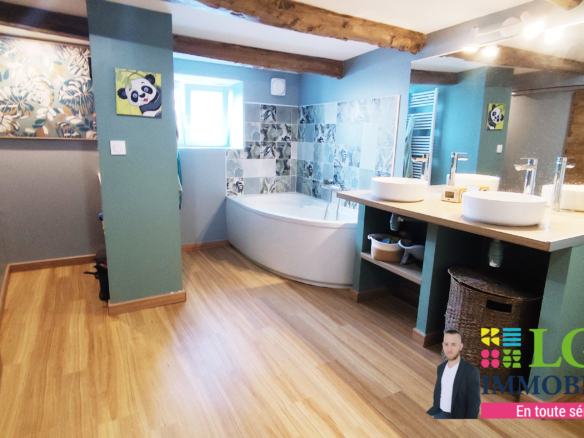 Au rez-de-chaussée, l’entrée s’ouvre sur une grande cuisine, qui communique avec un double salon équipé d’un poêle à bois. A ce même niveau, on trouve également une belle salle de bain avec baignoire, douche, double vasque, ainsi que des toilettes séparées dans le couloir.
