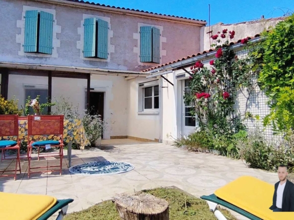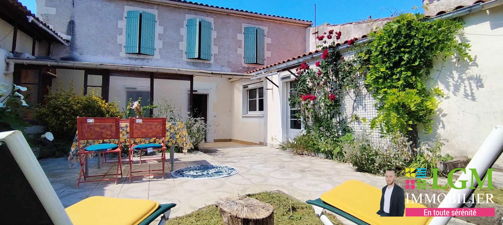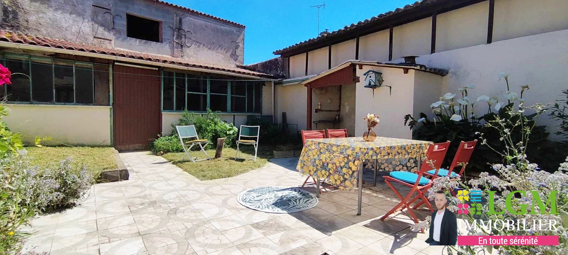 A l'extérieur vous découvrirez une jolie cour carrelée, fleurie, très ensoleillée et close de murs.